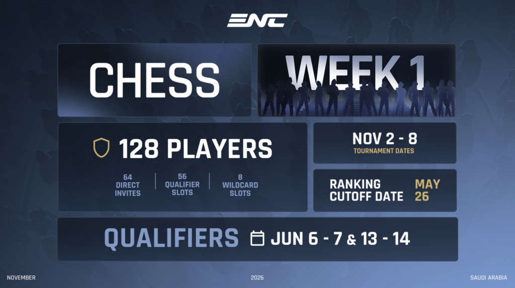 Set to take place in Riyadh, Saudi Arabia, the Esports Nations Cup will run from November 2 through November 29, 2026, with the Chess competition scheduled for November 2–8. A total of 128 players representing their nations will compete, making it one of the largest international chess tournaments ever held under an esports banner.